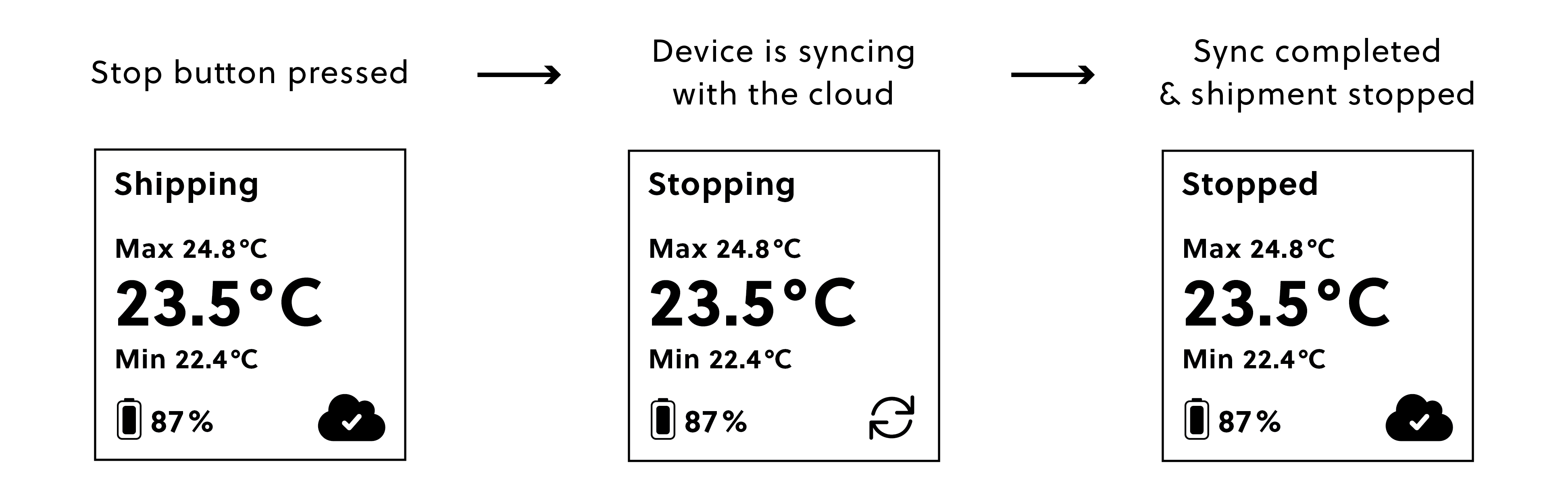 will remain in the cloud connection status section during the process.If the device is at the destination and syncs successfully with the cloud within 3 hours from the button press, the shipment will be delivered, and "Stopped" will appear on the display.