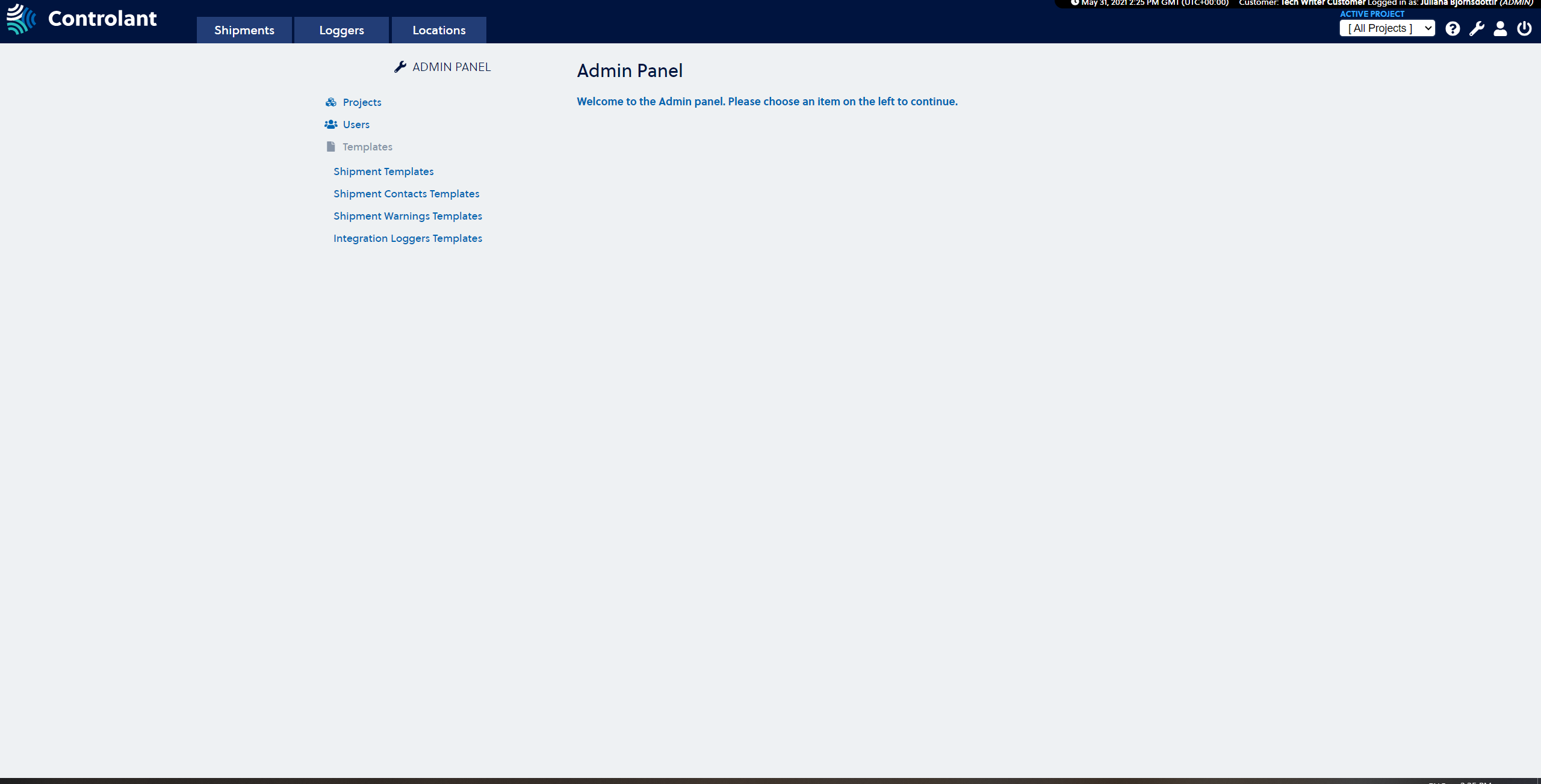 The Admin Panel is where the Admin user can manage Projects, Users, and Templates.