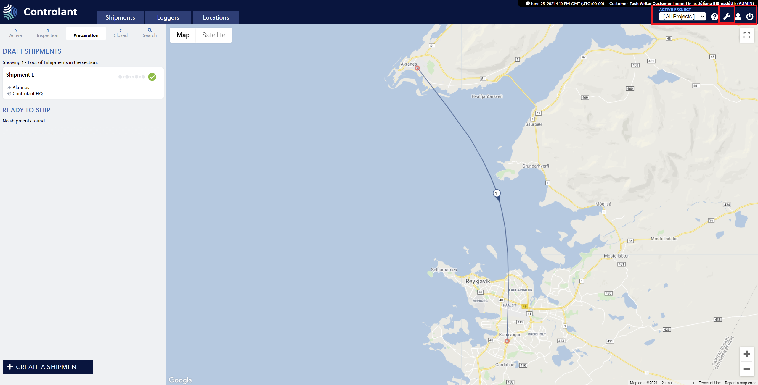 The Admin Panel is used by Admin users to access user rights and project management tools for the customer. To access the Admin Panel, press the Wrench in the upper right corner.