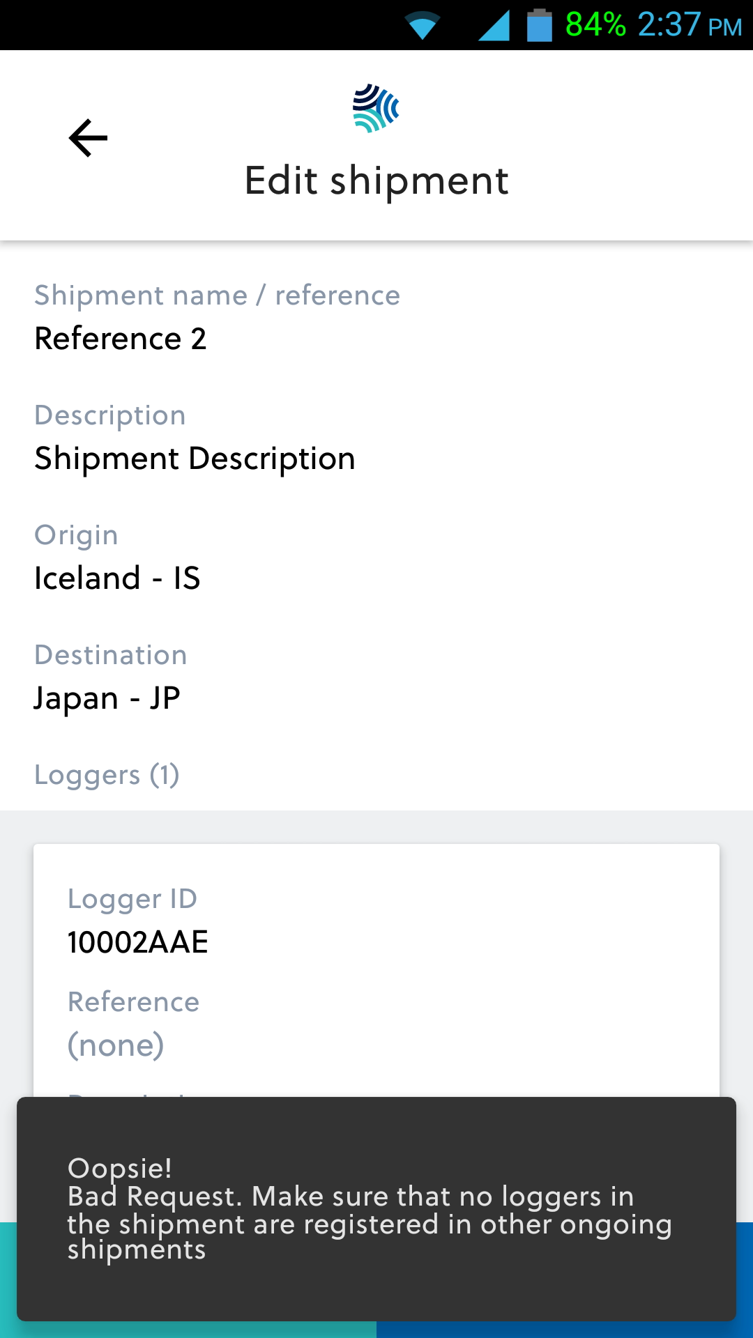 An alert is received if the logger assigned to the shipment is already assigned to another active shipment (e.g. Ready, Shipping):